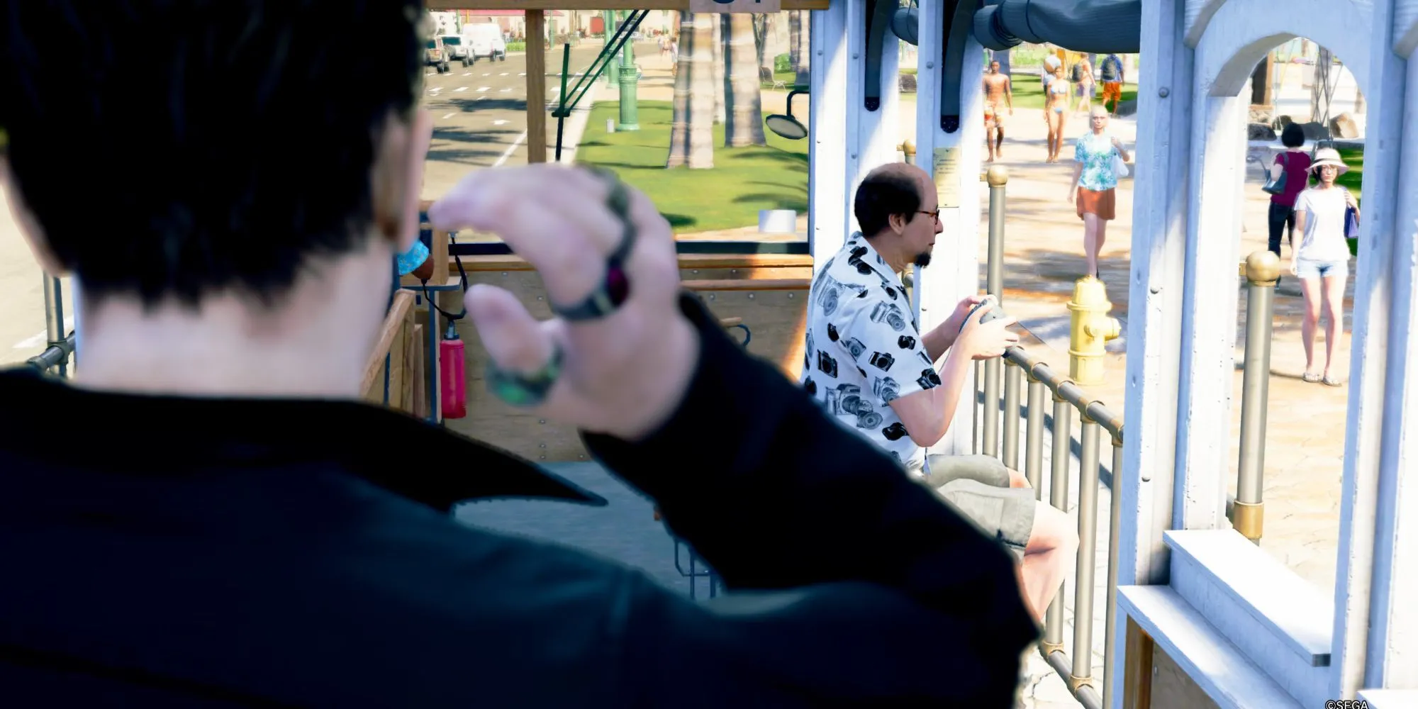 Majima đứng trước trạm xe điện Aloha Beach, chuẩn bị bắt đầu substory Sicko Snap trong Like a Dragon Pirate Yakuza in Hawaii